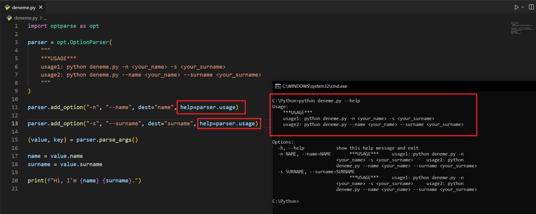 Peki, diyelim ki kullanıcı gerçekten de programı nasıl çalıştıracağını bilmiyor ve python deneme.py --help yaptı. O zaman ne yapabiliriz? Örneğin bir uyarı değişkeni tanımlayıp onu, sys.argv[1]'in --help olması koşulunda print ettirebiliriz. Ancak bunu yaptığımızda birden fazla olasılığı değerlendirmek zorunda kalırız ve her hata türü için ayrı kodlar yazmamız gerekir. optparse bunu da düşünmüş.