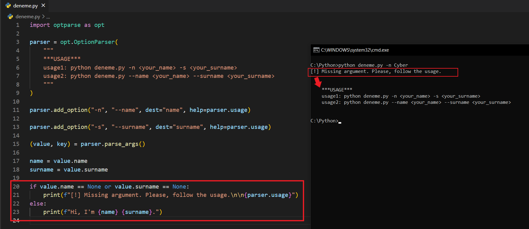 Burada dediğim şey şu: "Eğer name opsiyonunun value değeri None ise ya da surname opsiyonunun value değeri None ise kullanıcıyı uyar ve parser.usage fonksiyonunu göster. Değilse, ekrana çıktısını ver."