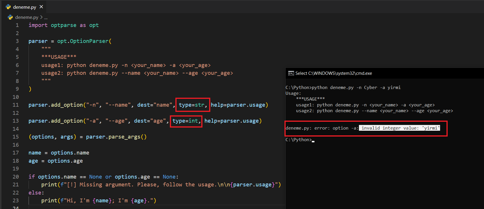 Gördüğünüz gibi bir sorun olmuyor. Ancak bazı durumlarda nasıl ki int tipinde girdi alırken int(input("")) diyor ve girilecek değerin tipini kesin olarak belirtiyorsak bunu optparse için de yapabiliriz.