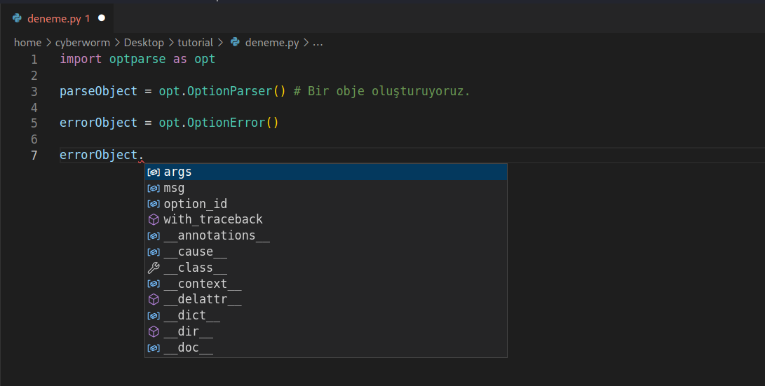 Başında '#' bulunan yeşil satır Python tarafından okunmayacak. Aşağı baktığınızda direkt olarak opt.OptionParser. dediğimizi ve bu şekilde bir kullanımla beraber de fonksiyonlara erişebildiğimizi görüyorsunuz. Ancak; aşağı bakalım.
