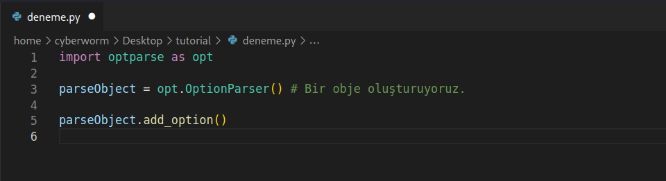 Burada yapmamız gereken ilk şey bir optparse objesi oluşturmak. Oluşturacağımız bu obje sayesinde optparse içerisindeki metotlara erişebileceğiz.