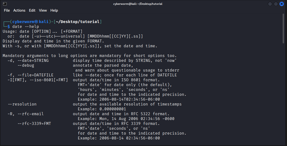 Bu, yukarıdaki örnekte 'date --help'. İşte, buradaki --help bizim argümanımız oluyor. Normal şartlarda sadece date yazmış olsaydınız bugünün tarihini alırdınız. Ancak date fonksiyona --help ifadesini verdiğiniz zaman ona uygun sonuçlar elde ediyorsunuz.