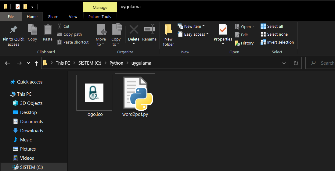 Gördüğünüz üzere bahsettiğim Python dosyası ve bizim sitenin ikonu aynı klasörde. Eğer tkinter gibi, GUI tabanlı projeleriniz varsa ve proje içerisinde farklı bir görseliniz varsa onu da aynı klasörde bulundurmak zorundasınız.