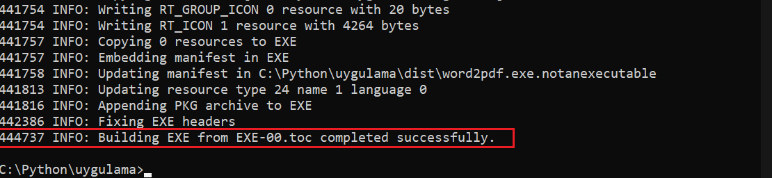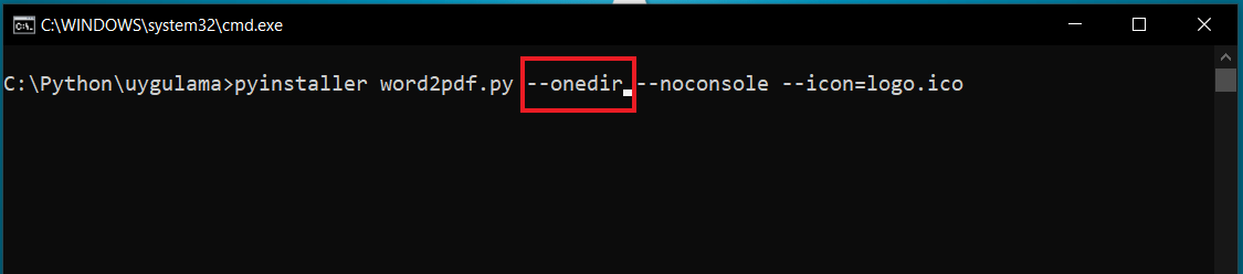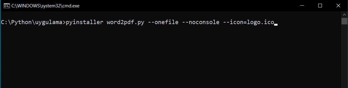 Yukarıdaki komutta yazanları tek tek açıklayalım. Zaten pyinstaller, modülümüzün adı iken word2pdf.py isimli dosya, .exe formatına dönüştürülecek dosya oluyor.