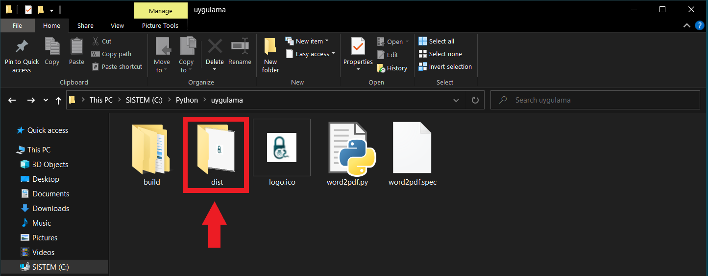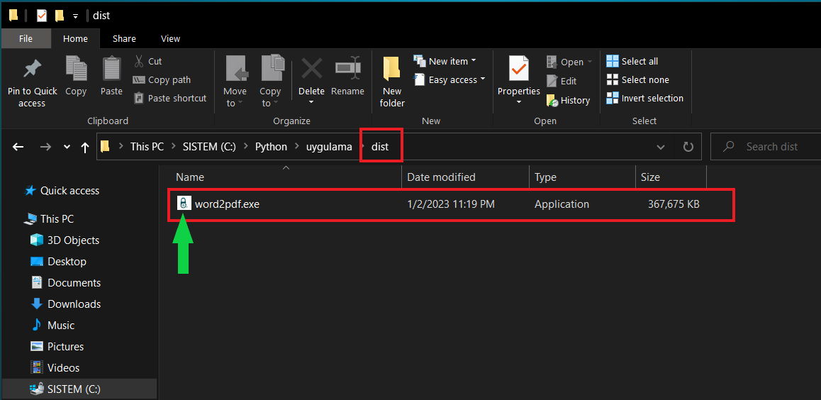 --onefile olarak verdiğimiz argümanı --onedir olarak ayarlıyoruz ve komutu çalıştırıyoruz. İşlemler tamamlandığında yine build, dist ve word2pdf.spec öğeleri gelecektir. .exe dosyasına erişmek için yine dist içerisine girmeniz gerekir.