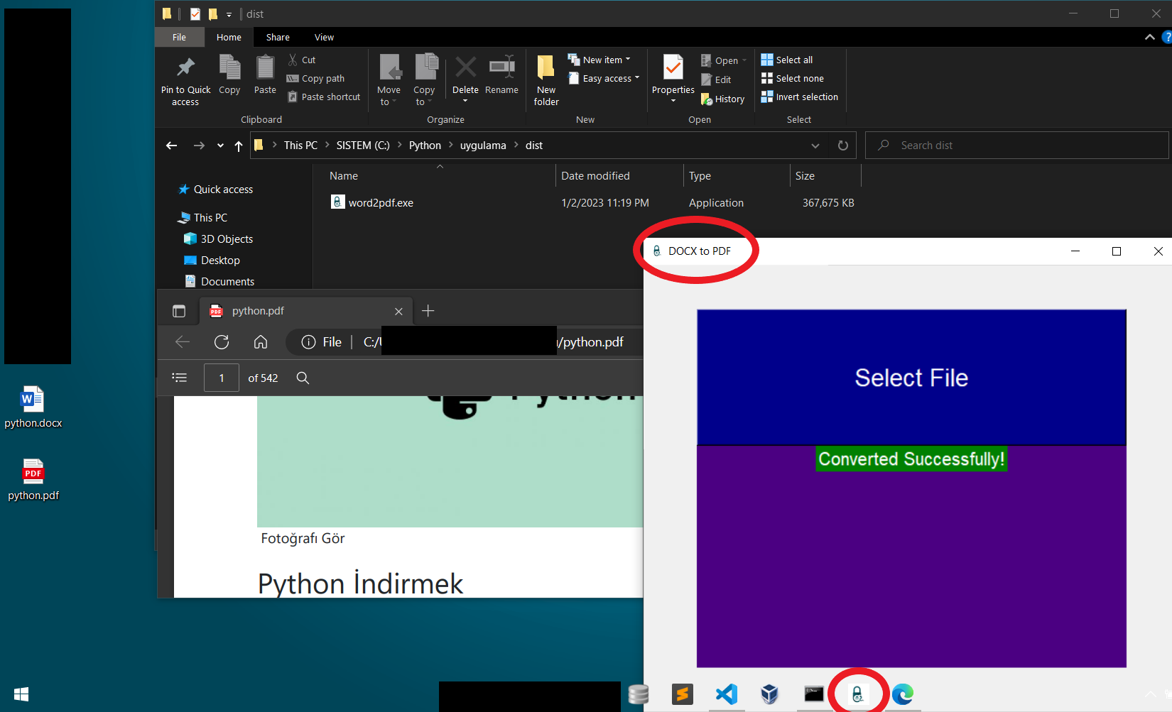 Ekran biraz karışıkmış gibi görünebilir ama kırmızı ile işaretlediğim yerlere bakarsanız ikonun, sanki normal bir uygulamaymış gibi geldiğini görebilirsiniz. Bu noktada word2pdf.py yazılımı da gayet güzel bir şekilde çalışıyor ki 542 sayfalık Python dokümanını PDF'e çevirebildik.