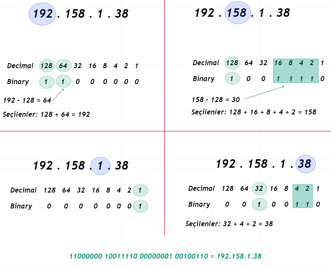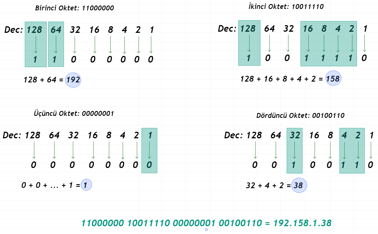 Önce Decimal tablomuzu yazdık. Daha sonra oktette yer alan Binary sayılarını yazdık ve hangi sayılar 1’e denk geliyorsa o sayıları işleme aldık; çıkan sonuç, oktetimizin sonucuydu (Üçüncü oktette yeşil kutu içerisinde bulunan 0, 1 olmalı; yanlış yazmışım).