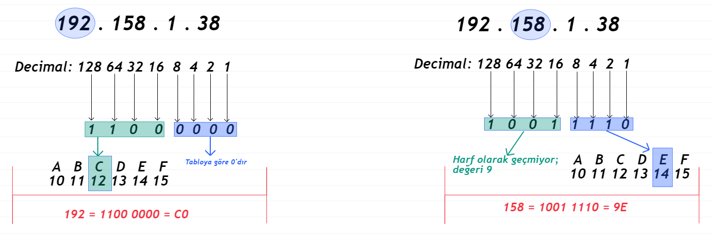 Az önce IP adresini Binary’e, ondan sonra tekrar Decimal’e dönüştürmüştük. Şimdi dilerseniz, IP adresini HexaDecimal’e dönüştürelim. Ben IP adresinin ilk iki oktetini yapacağım, kalan iki okteti siz yapmayı deneyin lütfen.