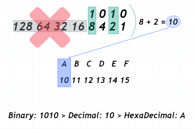 HexaDecimal kavramını öğrenmek için isterseniz önce eski bilgilerimizi tazeleyelim. Binary sayısını Decimal'e dönüştürürken 1 ile 128 arasında bulunan tabloyu alıyorduk, karşılığı '1' olan sayıyı işleme dahil ediyorduk. Örneğin:
