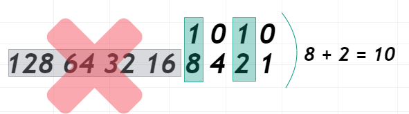 Yukarıda, Decimal olan bir veriyi (192) Binary sayı sistemine göre yazdık ve ortaya çıkan 8 biti ortadan ikiye böldük (yeşil ve mavi kutucuklar). Ayırdığımız bu kısımların karşılığına az önce verdiğim tablodan sırasıyla baktık ve sonucu bulduk. Ancak, dikkat ederseniz yeşil taraftaki 4 bitlik veriyi yapmakta zorlanıyoruz. Bunun için iki adet 4 bitlik verimizi de 8, 4, 2, 1