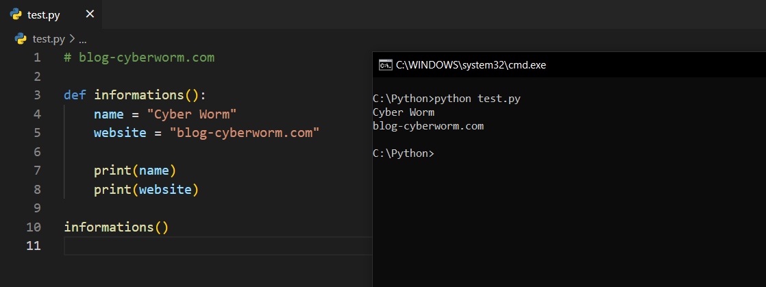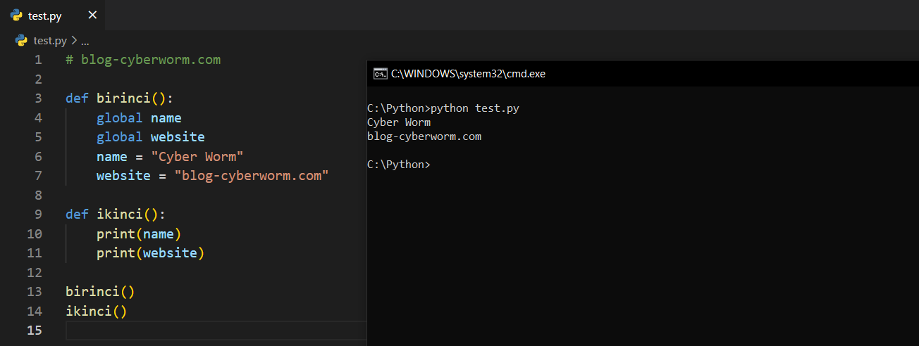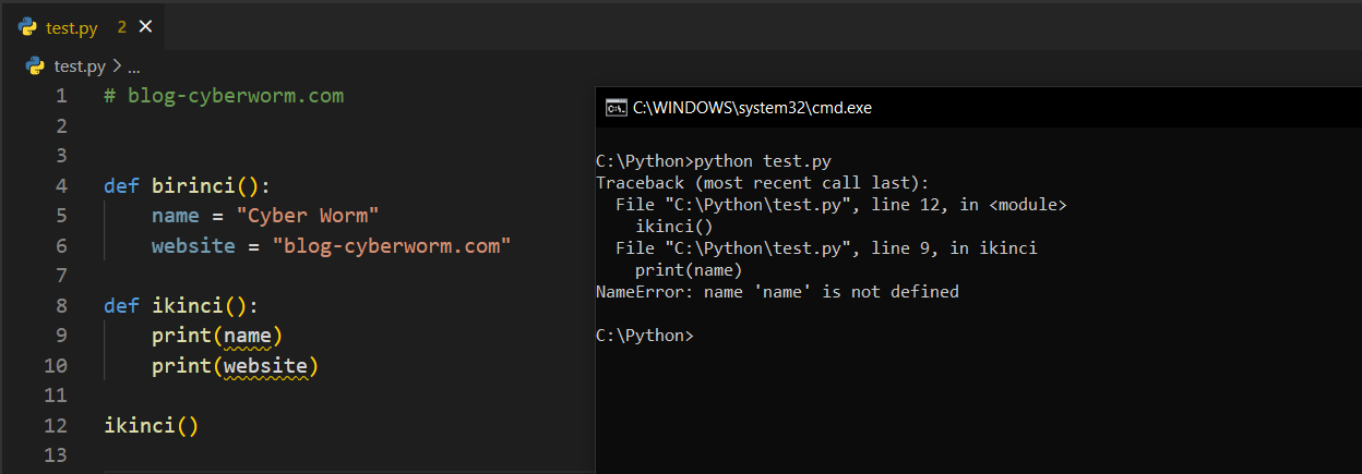 Peki, madem bunlar her yerden erişilebilir duruma geliyor; o zaman global name dedikten sonra fonksiyonun dışında name = "Cyber Worm" yapmayı deneyelim.