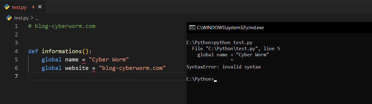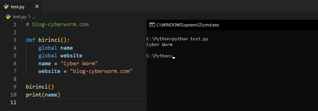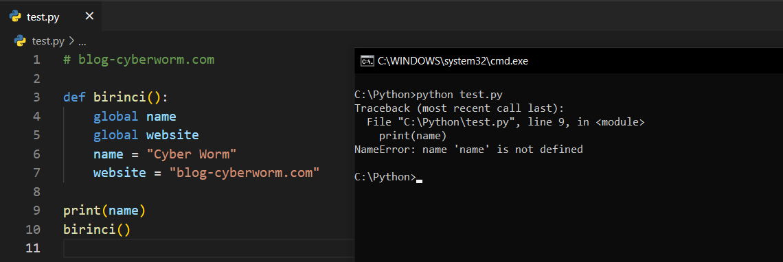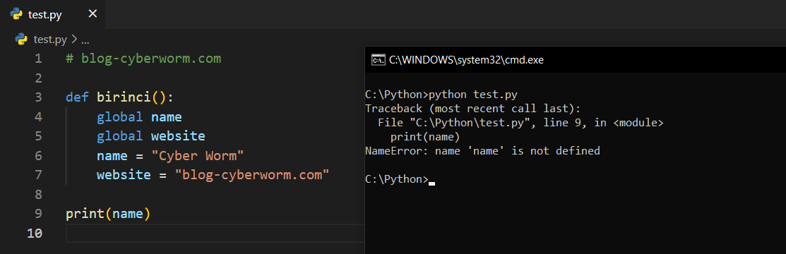 global anahtar kelimesini verirken bir değişkenin ismini tanımlamanız lazım; değişkenin kendisini değil. Yani yukarıdaki gibi global name = "Cyber Worm" ifadesini veremezsiniz.