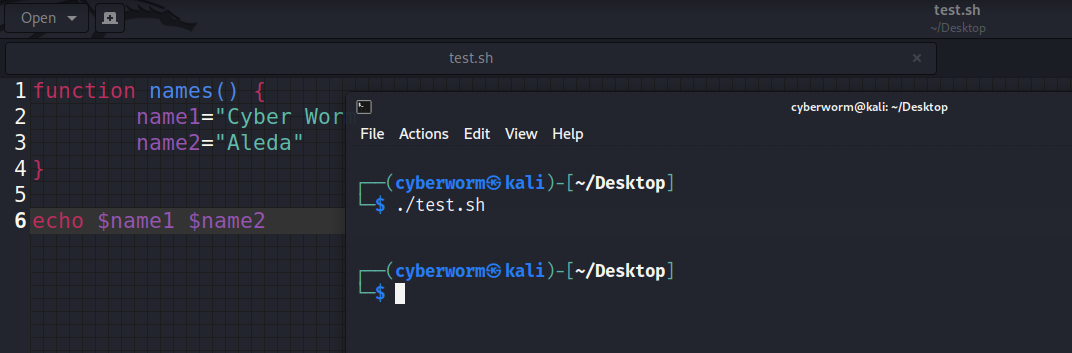 Yukarıdaki görsele iyi bakın. 'names' isimli bir fonksiyon tanımladım ve içerisine name1 ve name2 şeklinde iki değişken tanımladım. Daha sonra fonksiyonun dışına çıktım ve tanımladığım bu değişkenleri yazdırmaya çalıştım. Fakat sonuca baktığımızda herhangi bir çıktı alamadığımızı görüyoruz. Bunun sebebi, biraz önce söylediğim fonksiyonun kendi alanını yaratmasından kaynaklanıyor. Bunu daha iyi kavrayabilmeniz için normal bir değişken tanımlayıp onu yazdırmayı deneyelim.