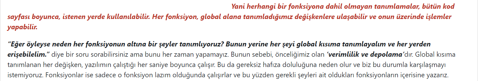 Fonksiyon içine değil; bir değişken tanımladığımızı düşünelim. Bu değişkene her yerden ulaşabiliriz, öyle değil mi? Onu yazdırabilir; başka bir yere ekleyebilir, bir yere aktarabiliriz. Ancak bir fonksiyonun içine tanımlanan değişkenlere dışarıdan müdahale edemeyiz. Ne demek istiyorum?