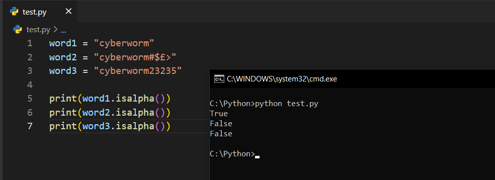 Gördüğünüz üzere word2 değişkeninin değerinde # ifadesi var. Dolayısıyla False değer döndü. word1 değişkeninde ise hem numerik hem de alfabetik ifadeler bulunduğu için True değeri döndü.