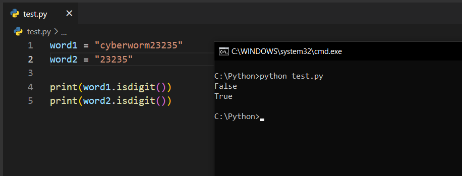isdigit()Bu fonksiyon ise bir string ifadenin sayılardan oluşup oluşmadığına bakar. Eğer yalnızca sayısal ifadeler mevcutsa True, başka herhangi bir ifade mevcutsa False değer döndürecektir.