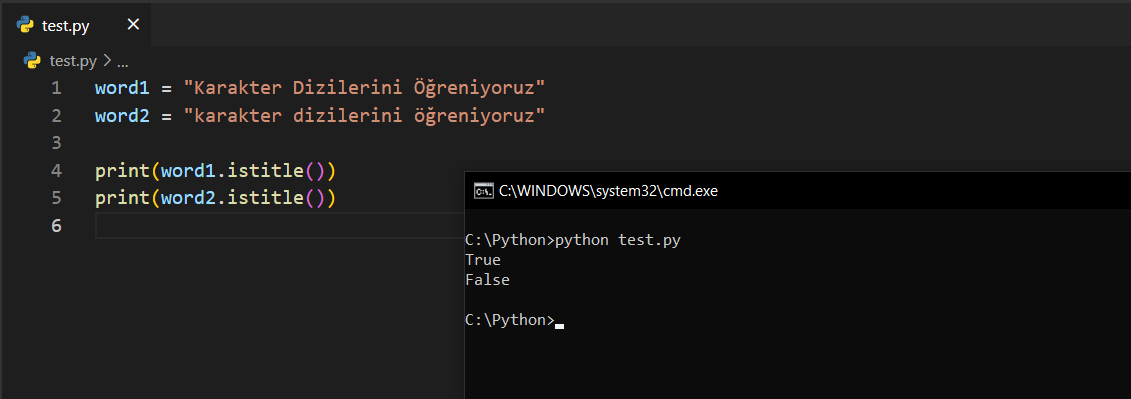 istitle()Bu fonksiyon, string içerisindeki her kelimenin ilk harfinin büyük olup olmadığına bakar. Eğer öyleyse True, değilse False değer döndürür.