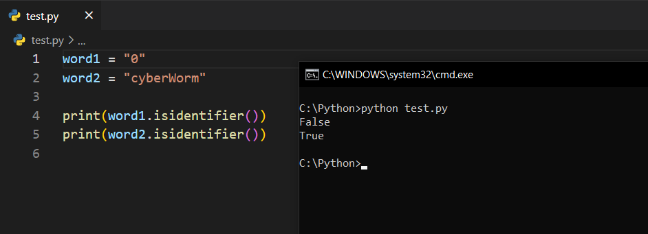 word1 = "0" değeri için False değer döndü çünkü "0" ifadesi ile değişken, sınıf ya da fonksiyon tanımlayamayız. Örneğin; 0 = "deger" diyemeyiz. Ancak cyberWorm = "deger" diyebiliriz yani bunu bir değişken, sınıf ya da fonksiyon tanımlarken kullanabiliriz. Dolayısıyla True değer döndü. Aşağıdaki görsel daha açıklayıcı olabilir.