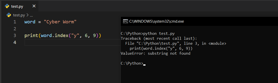 Arayacağınız karakteri yazdıktan sonra başlangıç ve bitiş değerleri belirleyebilirsiniz. Örneğin yukarıdaki görselde 'y' harfini aradığımızı görüyorsunuz. Normalde word değişkeni içerisinde o harf mevcut ama ben 6, 9 dediğim için bu harfi altıncı ve dokuzuncu index'ler arasında arayacaktır. Altıncı index W, dokuzuncu index m harfine denk geldiği ve o arada y harfi bulunmadığı için -1 sonucu döndürüldü.