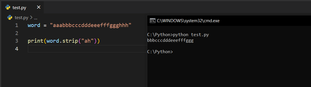 a harfi başarıyla çıkarıldı ama d harfi hâlâ yerinde duruyor. Python, sağa ve sola baktığında sol tarafta a harfini gördü ve onu çıkardı. Sonrasında d harfi için sağa ve sola baktığında d harfini göremedi çünkü sol tarafta b, sağ tarafta ise h harfi mevcut. Dolayısıyla d harfini çıkaramadı. Bu, strip() fonksiyonunun sağa ve sola bakıyor olmasından kaynaklıdır.