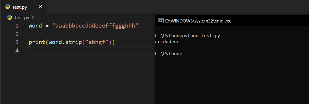 Sol tarafta a ve b harfleri mevcut. strip() fonksiyonu a harflerini çıkardıktan sonra b harfleri geldiği için ve parametre olarak b harfini de verdiğimiz için onları da yok etti. Sağ taraf için de aynı şeyler geçerli.