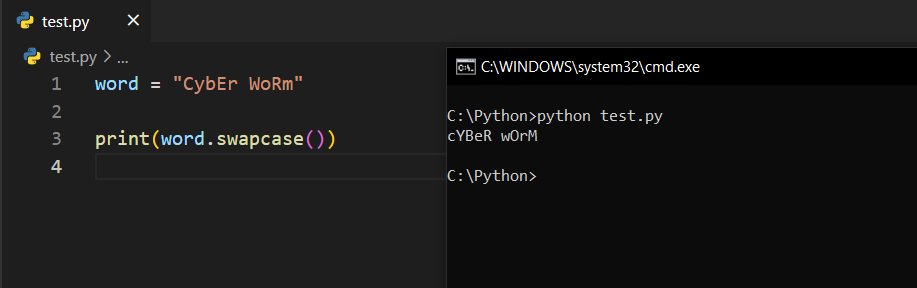 swapcase()Bu fonksiyon, sahip olduğunuz string yapıdaki küçük harfleri büyük harfe, büyük harfleri ise küçük harfe dönüştürüyor.