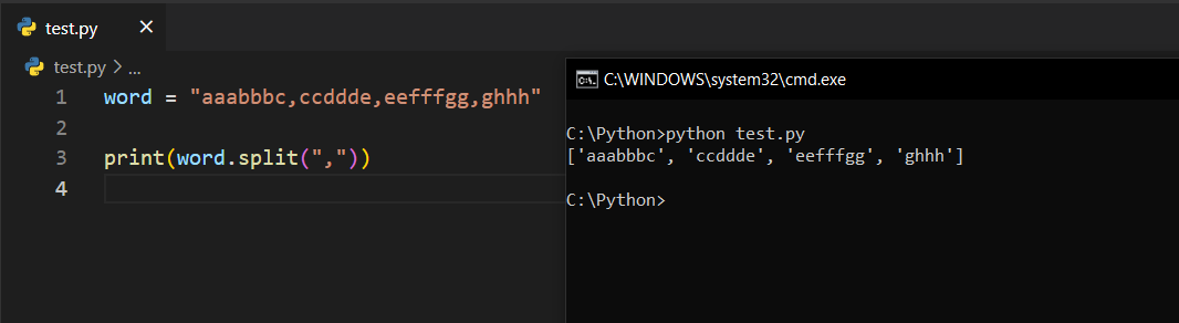 string ifadenin bazı yerlerine virgül koydum ve split(",") dedim. Bu sayede Python'a şunu demiş olduk: "Virgül gördüğün yerde ayır".