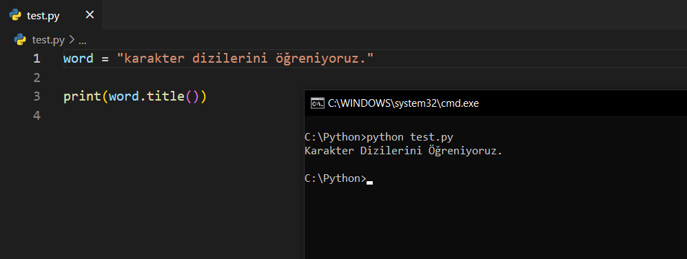 title()Normal şartlarda "Başlık" anlamına gelir. Zaten buna göre anlamlandırmanız gerekir. Başlıklarda her kelimenin ilk harfi büyük yazıldığından dolayı title() fonksiyonu bir metin içerisindeki bütün kelimelerin ilk harfini büyük yapacaktır.