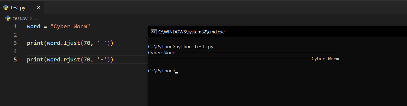 center()Bu fonksiyon, karakter dizinizi ortalamanıza olanak tanır. İki argüman alacaktır. Birinci argüman int bir değer olmalıdır ve bu, verilecek boşluğu simgeler. İkincisi ise (bunu vermenize gerek yok) verdiği o boşlukları bir karakterle doldurmanıza olanak tanır. Görünce daha net anlayacaksınız.