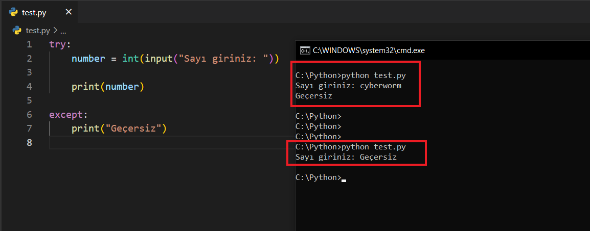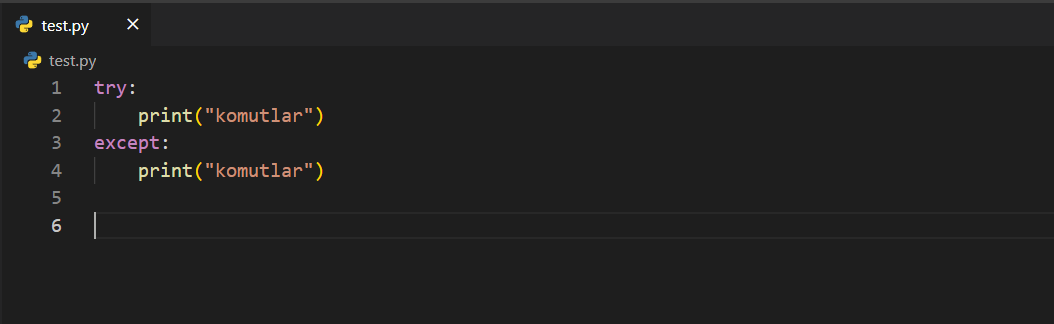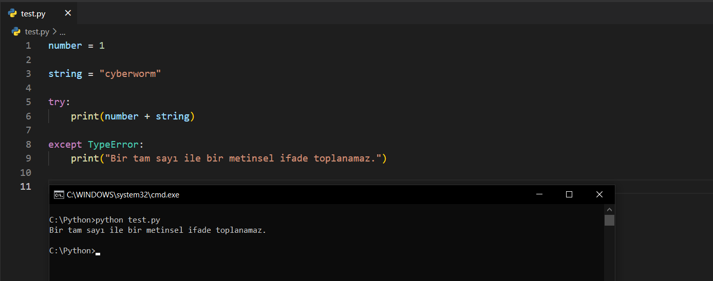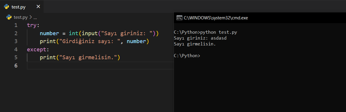 try: dedikten sonra girintili bir şekilde komutlarımızı yazıyor, sonrasında except: diyerek yine girintili bir şekilde komutlarımızı giriyoruz. Bu noktada Python try: kısmına yazdığımız kodları deneyecektir. Bu kodların çalışması sırasında herhangi bir hata gelirse bunu except: ile yakalayıp bizim istediğimiz ve belirlediğimiz hata mesajını gösterecektir. Ufak bir örnek yapalım.