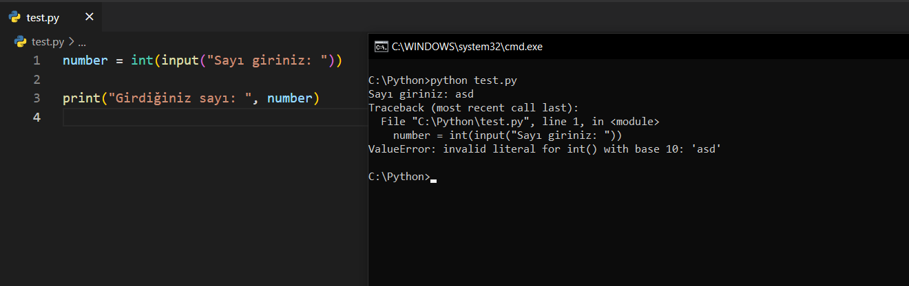 Bu basit kod ile kullanıcıdan bir sayı istiyoruz. Normal şartlarda int(input()) dediğimiz için kesinlikle bir tam sayı girmesini istiyoruz. Çıktı kısmına baktığınızda ben, istenen değeri asd olarak vermişim yani bu bir tam sayı değil. Bu yüzden ValueError:... şeklinde bir hata aldık. Peki, yazılımdan hiç anlamayan biri bu hata mesajını görürse ne anlayabilir? Yüksek ihtimalle 15 saniye içinde programı kullanmaktan vazgeçecektir. Şimdi, aynı kodu try-except blokları ile yapalım.
