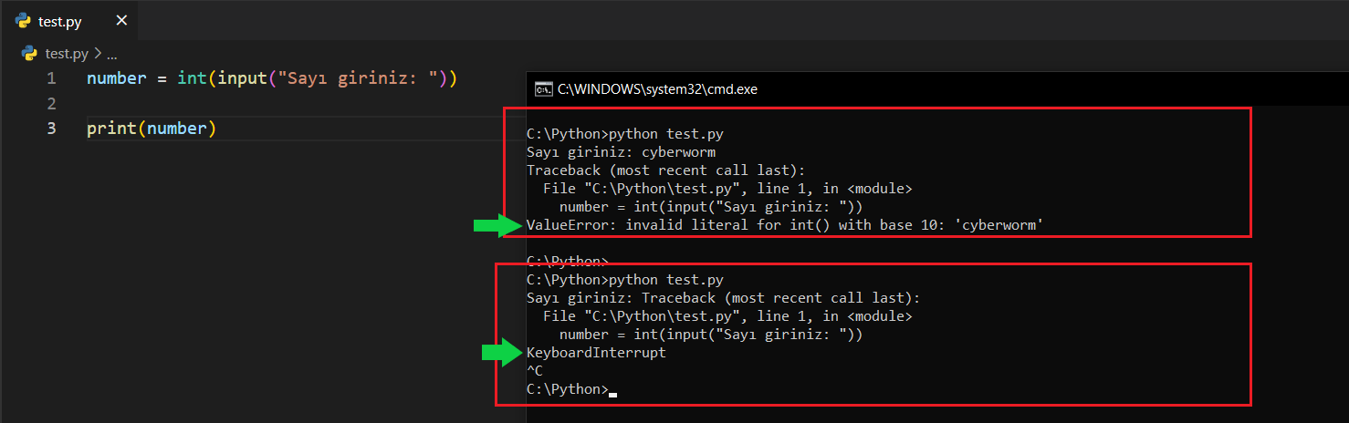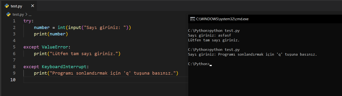 İlk kırmızı kutuda sayı girmedim ve except bloğu bunu algıladı. İkinci kırmızı kutuda CTRL + C kombinasyonu ile programı sonlandırdım ve hata mesajı almak yerine yine except sayesinde normal bir mesaj aldım. Demek istediğim şey şu: "Bir except bloğu ile birden fazla hatayı kontrol edebilirsiniz."