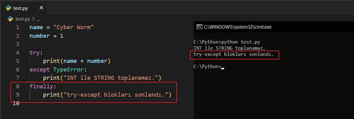 finallyAslında try-except blokları içerisinde ele alınan bir blok daha vardır; finally bloğu. "Finally" kelimesinin anlamı "sonunda, en sonda" şeklindedir. Bu blok, try-except bloklarından sonra gelir ve her hâlükarda çalışır. Eğer bir try-except bloğunda kesinlikle çalışmasını istediğiniz bir kod varsa onu finally içerisine yazabilirsiniz. Hemen bakalım.