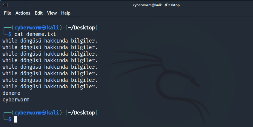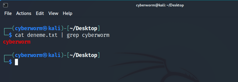 Bu kısımda, biraz önceki deneme.txt dosyasından cyberworm kelimesini bulacağız. Eğer kelime mevcutsa onu bize gösterecek ama mevcut değilse bir şey yazmayacak. Bunun için 'cat' komutu ile birlikte 'grep' komutunu kullanacağız. Grep, 'tutmak, kavramak' anlamına gelir. Nasıl kullanıldığını inceleyelim.