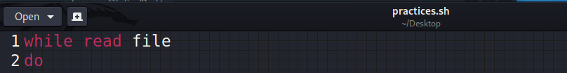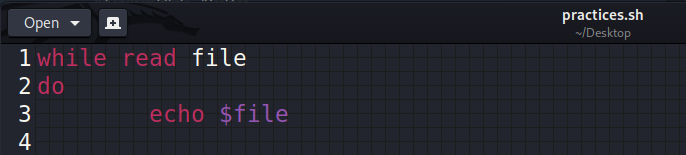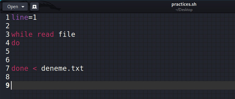 Bunun için daha önce gördüğümüz 'read' komutunu kullanacağız. while anahtar kelimesini verdikten sonra herhangi bir koşul falan yazmıyoruz. Sadece 'read' diyoruz ve bir değişken ismi belirliyoruz. Daha sonraki iskelet aynı; 'do' diyoruz. Fakat burada söylediğimiz şey; "file isimli değişken okunduğu sürece yap".