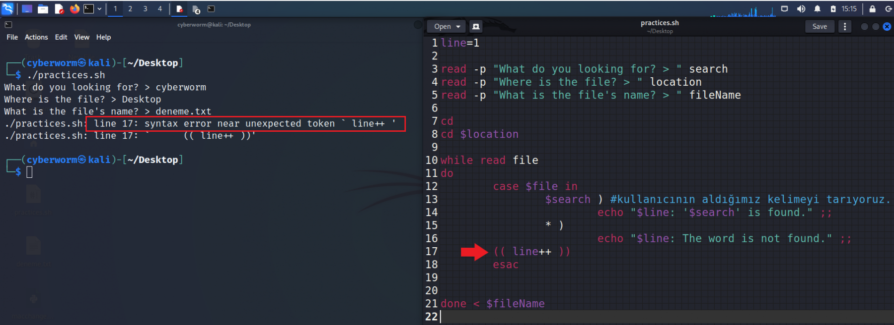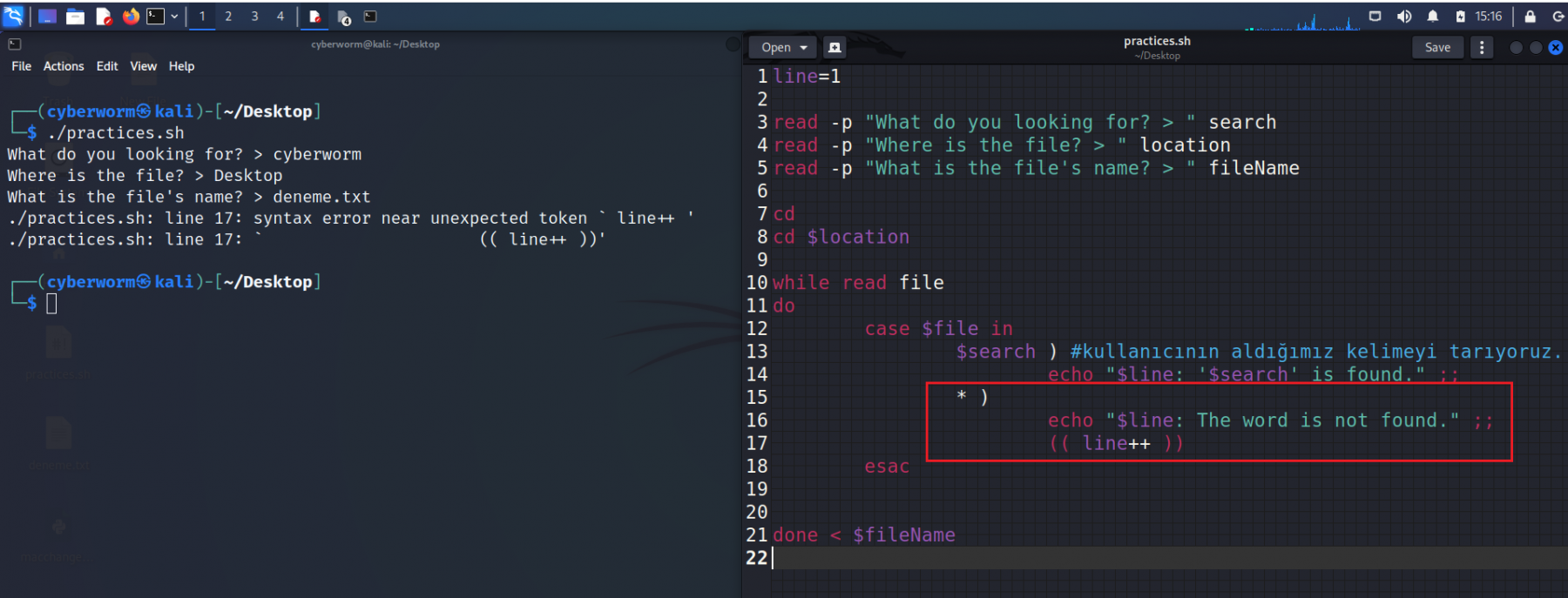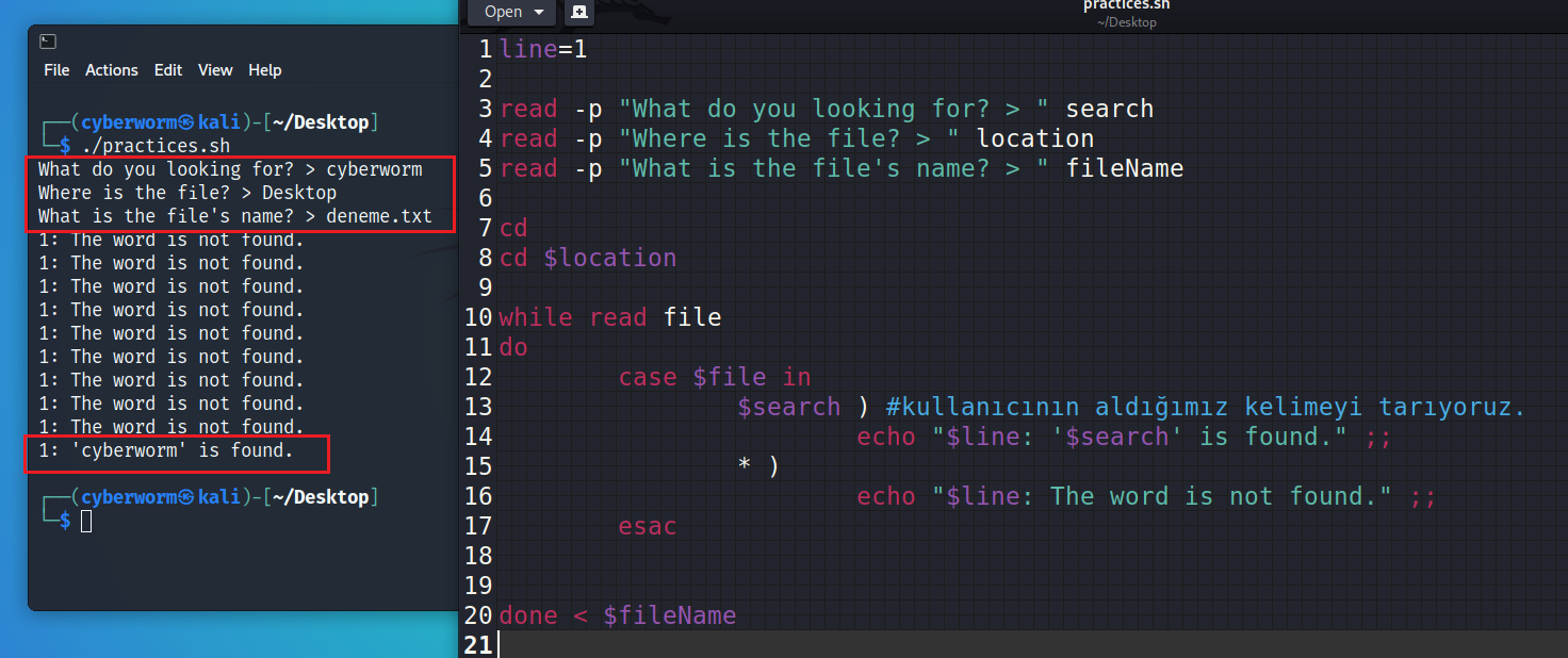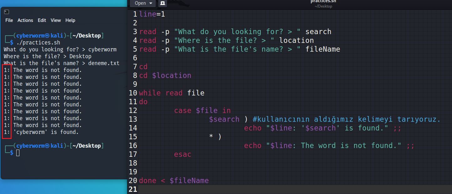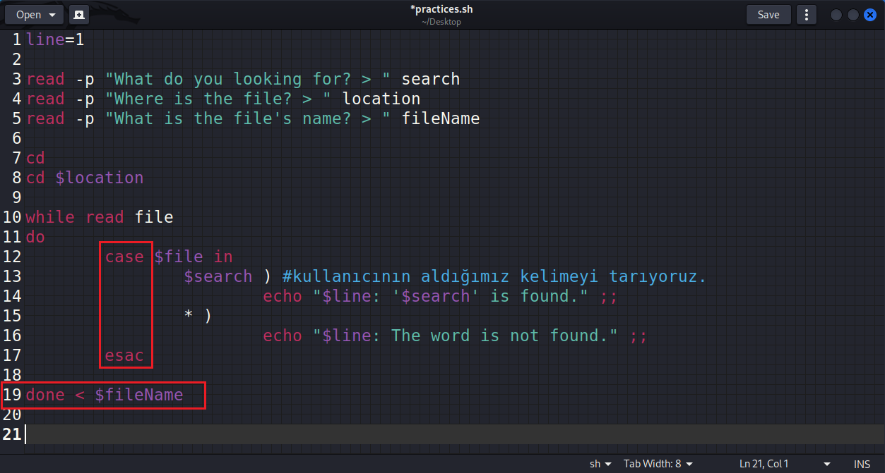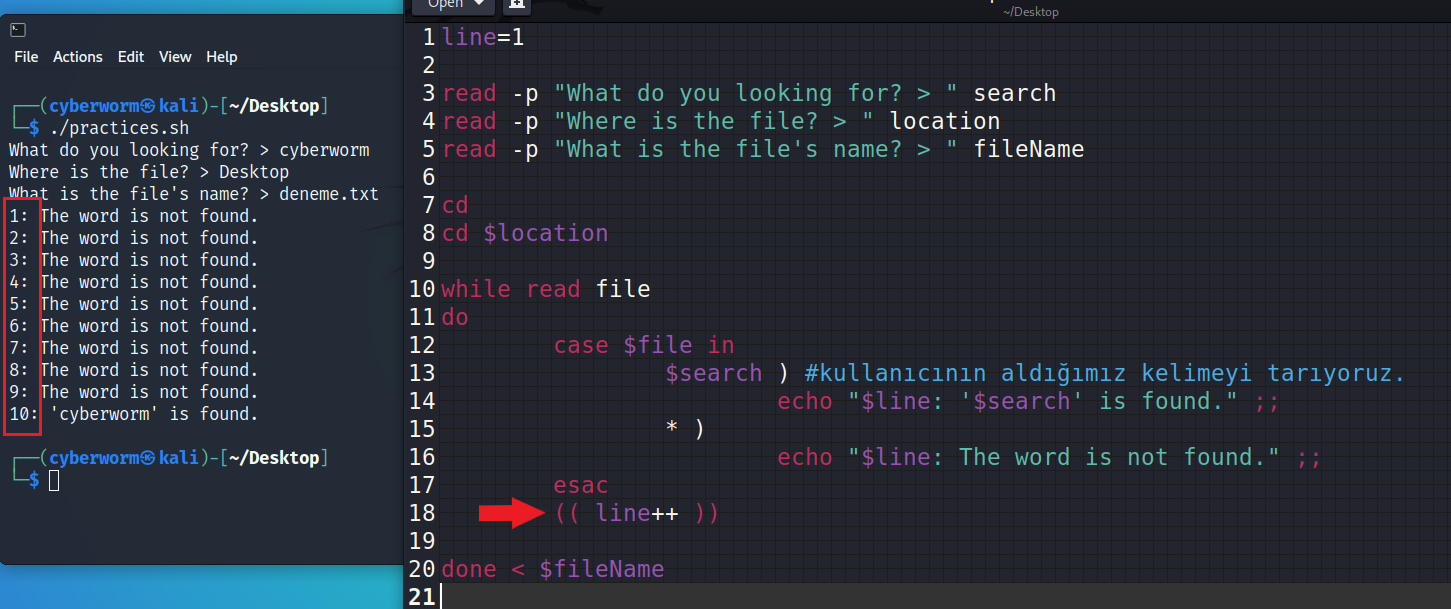 while döngüsünü anlatırken işlemlerin, baştan sonra ilerlediğini ve koşul sağlanana kadar bunun tekrarlandığını söyledim. Bu noktada Bash, while döngüsünün içine girdiğinde ilk önce case'e bakıyor ve aradığımız kelimeyi arıyor. İlk seferde bunu bulamadığını düşünelim. Bu durumda Bash, esac üzerinden case'i geçici olarak kapatacak ve tekrar while döngüsünün başına dönecek. İşte tam bu noktada (( line++ )) işlemini, case'in dışına yani esac'ın altına vermemiz lazım ki Bash, case'den çıktığında bu sayıyı artırsın ve başa dönüp işlemleri tekrarlasın. Böyle olduğunda sayı bir artacak ve bir sonraki case ziyaretinde $line değişkeni yeni değerini alacaktır.