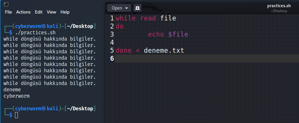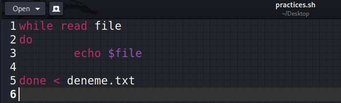 done < deneme.txt şeklinde bir komut verdik. Bu noktada, biraz önce 'read file' diyerek okuduğumuz dosyanın ne olacağını burada belirliyoruz. Yani bu kod parçasında şunu demiş olduk: "deneme.txt dosyasını oku ve yazdır". Şimdi, çalıştırıp bakalım.