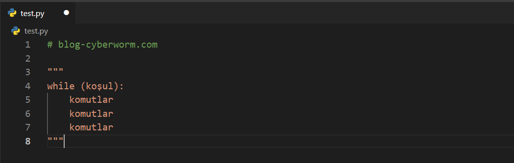 while anahtar kelimesini yazdıktan sonra bir parantez açıyoruz ve koşulumuz ne ise onu, bu parantezler arasına giriyoruz. Sonrasında klasik iki nokta üst üste ifadesini koyuyoruz ve alt satıra, girintili bir şekilde kodlarımızı yazıyoruz. Şimdi, bunun nasıl çalıştığına bakalım.