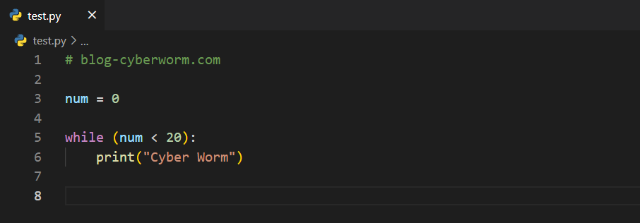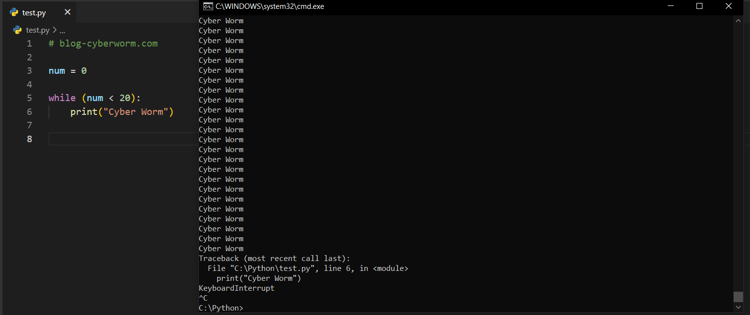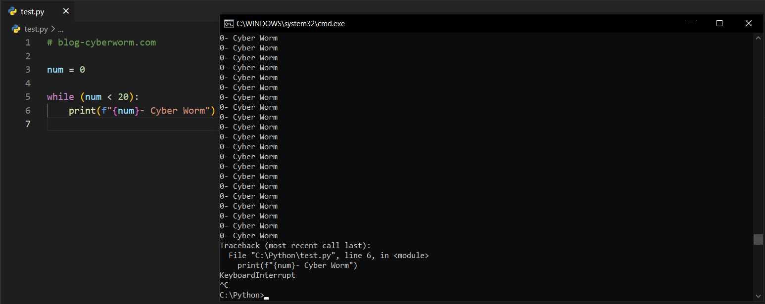 Biraz önceki kod neden sonsuz döngüye girdi? Biz, num adında bir değişken atadık ve ona 0 değerini verdik. Sonrasında 'while (num < 20)' ve 'print("Cyber Worm")' ifadesini verdik. Bunun anlamı; "num değişkeni 20'den küçük olduğu sürece ekrana 'Cyber Worm' yazdır." şeklindeydi. Bu noktada num değişkeni, her hâlükârda 20'den küçük olmaz mı? Yani 0, 20'den küçüktür, öyle değil mi? Biz de zaten "20'den küçük olduğu sürece yap" dediğimiz için bu bir sonsuz döngüye yol açtı.