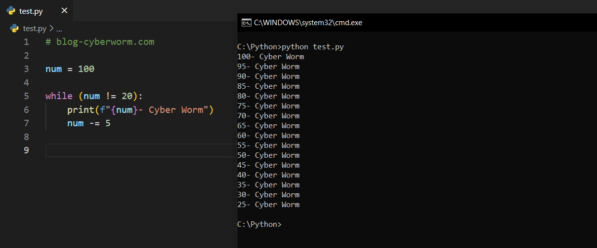 Sonrasında Python, tekrar num değişkeninin 20'den küçük olup olmadığına baktı ve num değerinin 1 olduğunu görünce bunun 20'den küçük olduğuna karar verdi. Koşul sağlandığı için ekrana 'Cyber Worm' yazdırdı ve num değerini bir artırarak 'num = 2' olmasını sağladı.