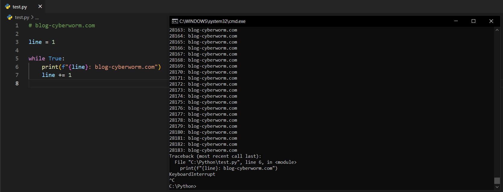 Terminal ekranının kaydırma çubuğuna bakarsanız en aşağıda olduğunu göreceksiniz. Bunun sebebi, aslında bu kodun bir sonsuz döngüye yol açmasından kaynaklanıyor. Ben bu kodun çalışmasını, 'CTRL + C' ile durdurdum; eğer durdurmasaydım sonsuza kadar 'Cyber Worm' yazdıracaktı. Bu ne saçmalık?