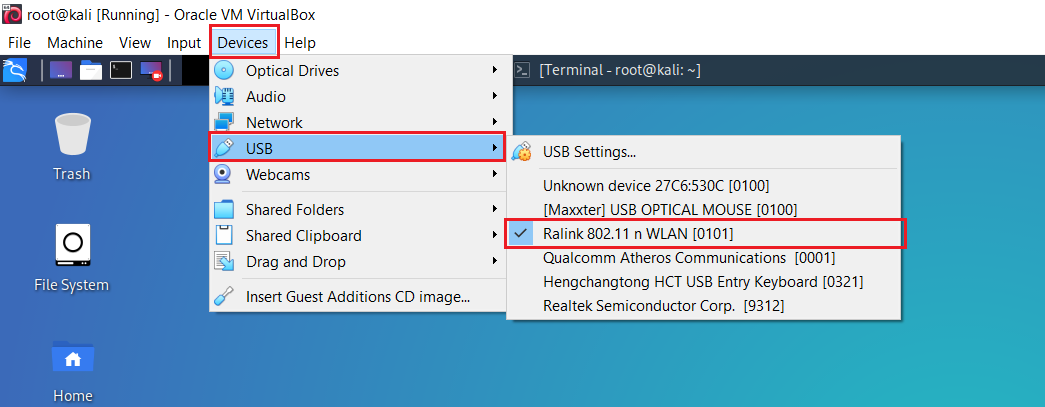 Bunun için ilk önce Kali'nin menüsünden 'Devices' kısmına basmamız ve 'USB' seçeneği üzerine gelmemiz gerekiyor. Burada, cihazımız seçili değilse seçmemiz gerekiyor (yanında tik işareti olmalı).