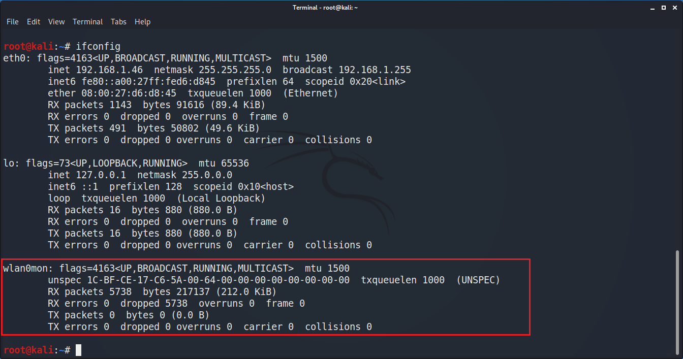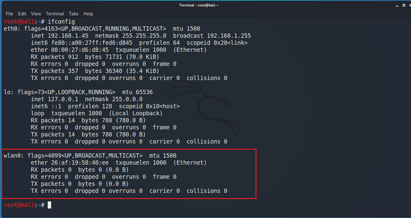 Şimdi, bunu seçtikten sonra Kali'nin, cihazımızı gerçekten tanıyıp tanımadığını öğrenmek için 'ifconfig' komutunu çalıştırıyoruz.