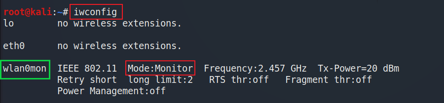 Bunu yaptıktan sonra kontrollerimizi de sağlamamız gerekiyor. Az önce 'ifconfig' yapmıştık. Şimdi, 'iwconfig' çalıştırmamız gerekiyor ki bize hangi modda olduğumuzu göstersin.