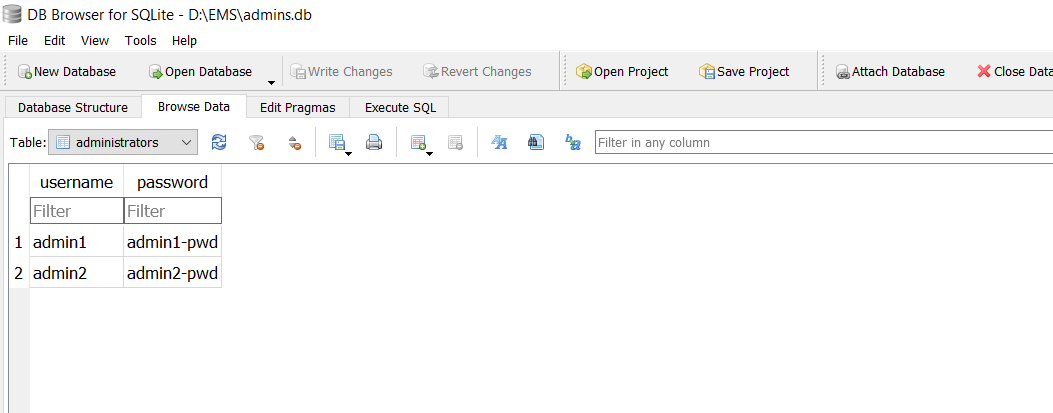 Oldukça hızlı ve basit bir şekilde oluşturdum. Geliştirme önerileri kısmında bu noktada neler yapabileceğinizi anlatacağım. administrators isimli bir tablo içerisinde yalnızca username ve password isimli iki sütun açtım ve değerlerini girdim. Biri admin1, diğeri admin2 olmak üzere iki adet adminimiz mevcut.