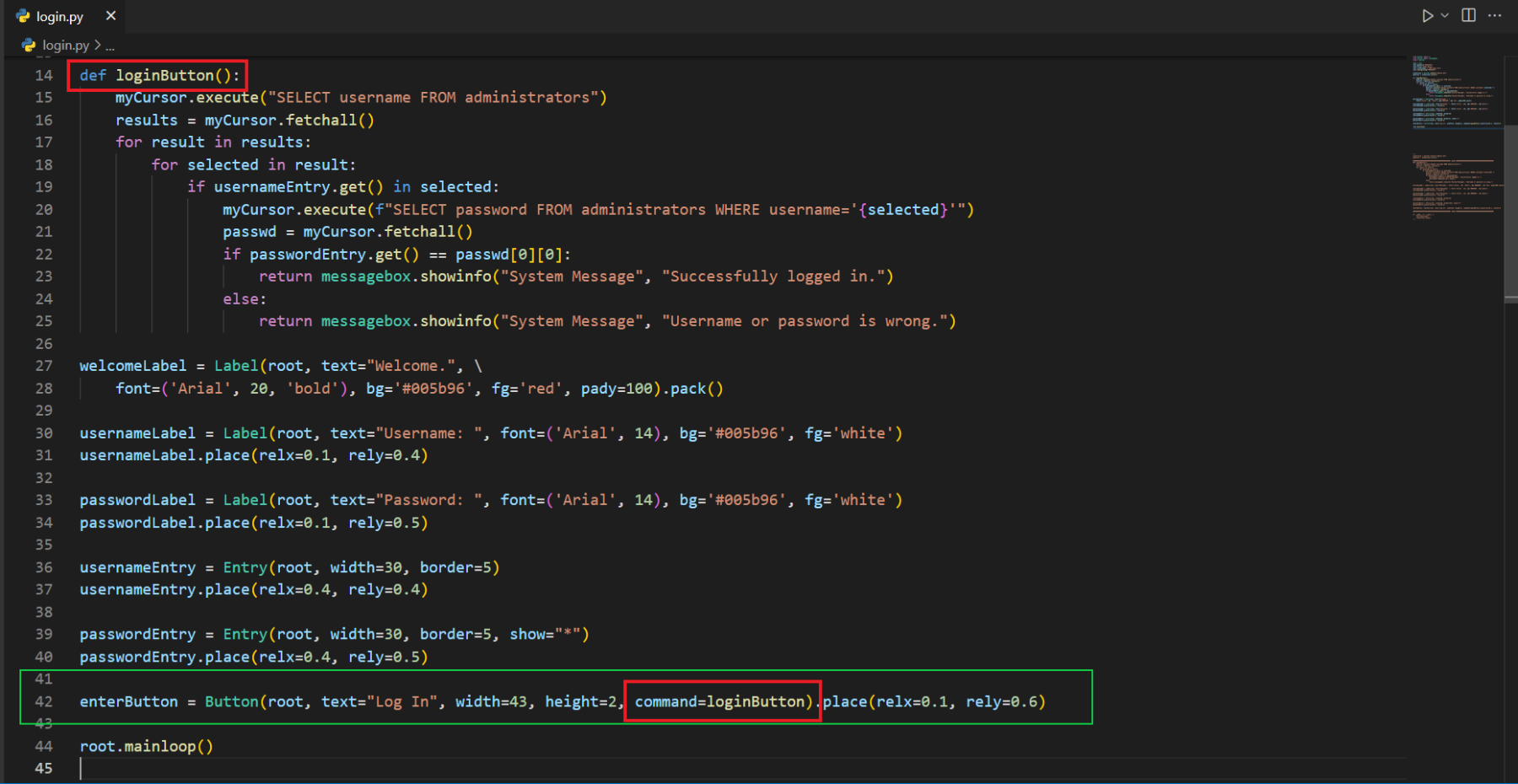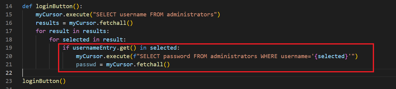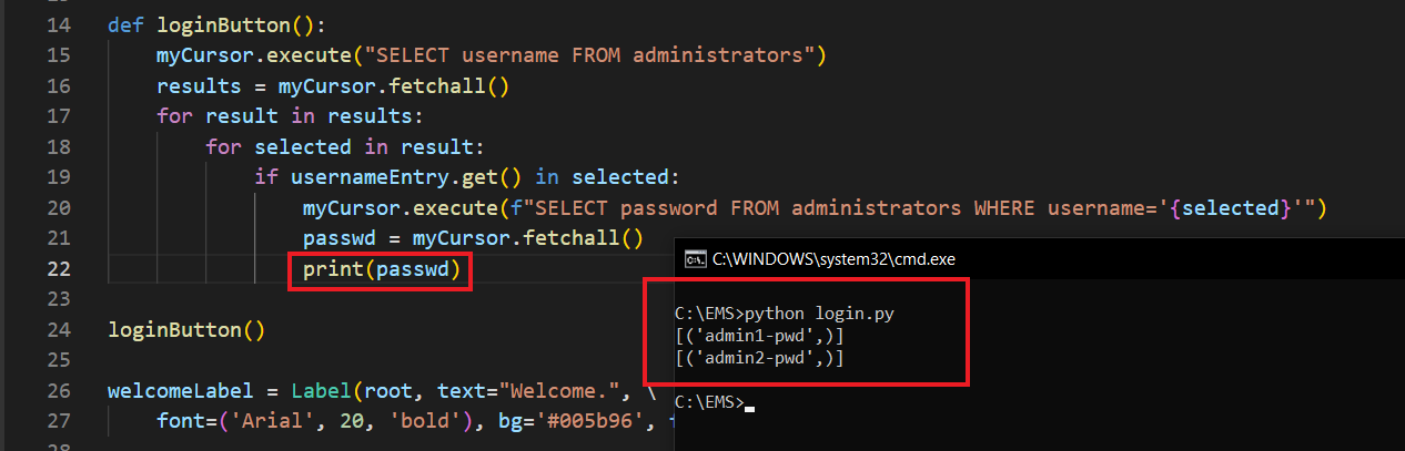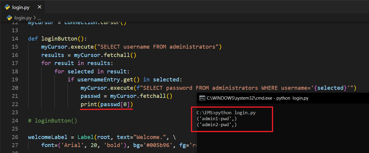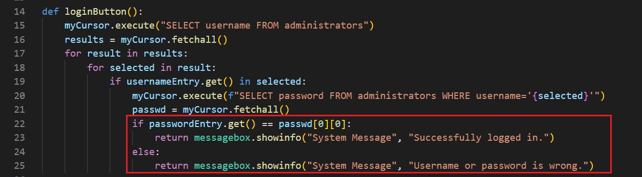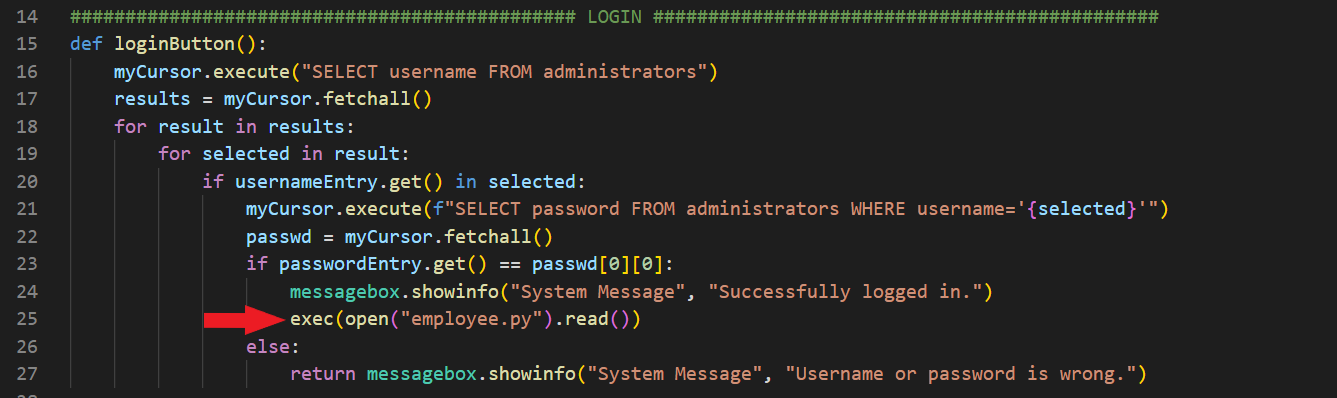 ############################################## LOGIN ##############################################def loginButton(): myCursor.execute("SELECT username FROM administrators") results = myCursor.fetchall() for result in results: for selected in result: if usernameEntry.get() in selected: myCursor.execute(f"SELECT password FROM administrators WHERE username='{selected}'") passwd = myCursor.fetchall() if passwordEntry.get() == passwd[0][0]: messagebox.showinfo("System Message", "Successfully logged in.") exec(open("employee.py").read()) else: return messagebox.showinfo("System Message", "Username or password is wrong.")welcomeLabel = Label(root, text="Welcome.", font=('Arial', 20, 'bold'), bg='#005b96', fg='red', pady=100).pack()usernameLabel = Label(root, text="Username: ", font=('Arial', 14), bg='#005b96', fg='white')usernameLabel.place(relx=0.1, rely=0.4)passwordLabel = Label(root, text="Password: ", font=('Arial', 14), bg='#005b96', fg='white')passwordLabel.place(relx=0.1, rely=0.5)usernameEntry = Entry(root, width=30, border=5)usernameEntry.place(relx=0.4, rely=0.4)passwordEntry = Entry(root, width=30, border=5, show="*")passwordEntry.place(relx=0.4, rely=0.5)enterButton = Button(root, text="Log In", width=43, height=2, command=loginButton).place(relx=0.1, rely=0.6)############################################## LOGIN ##############################################if __name__ == "__main__": root.mainloop() connection.close()