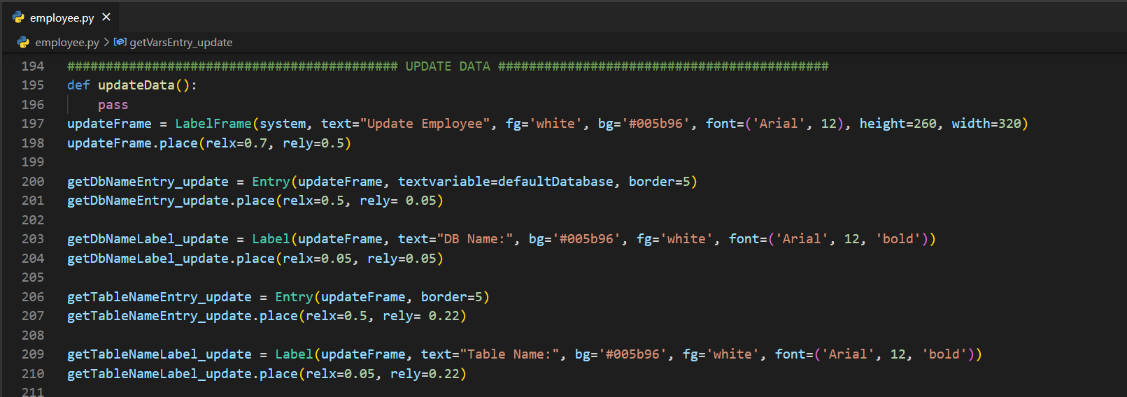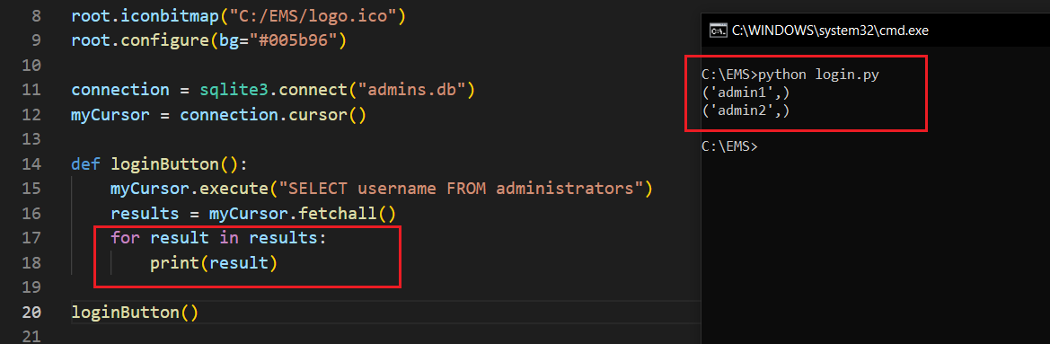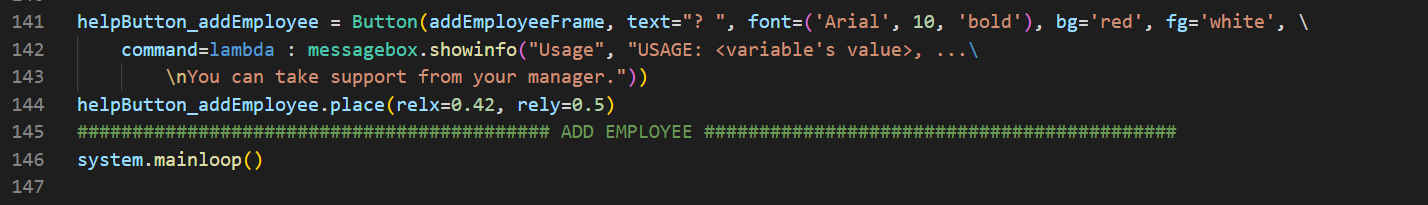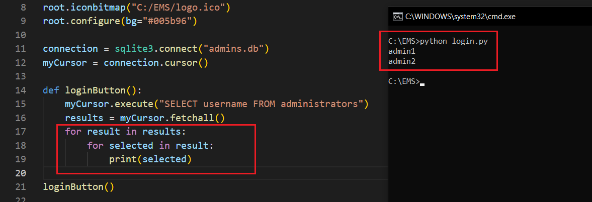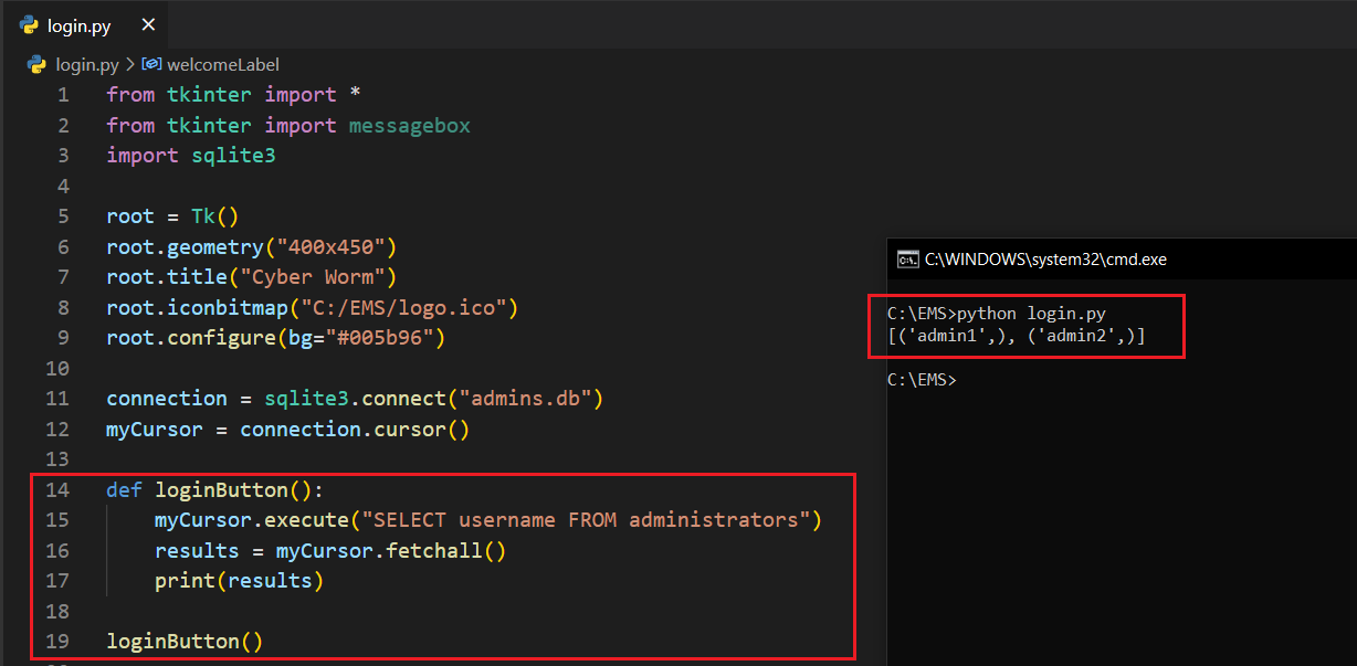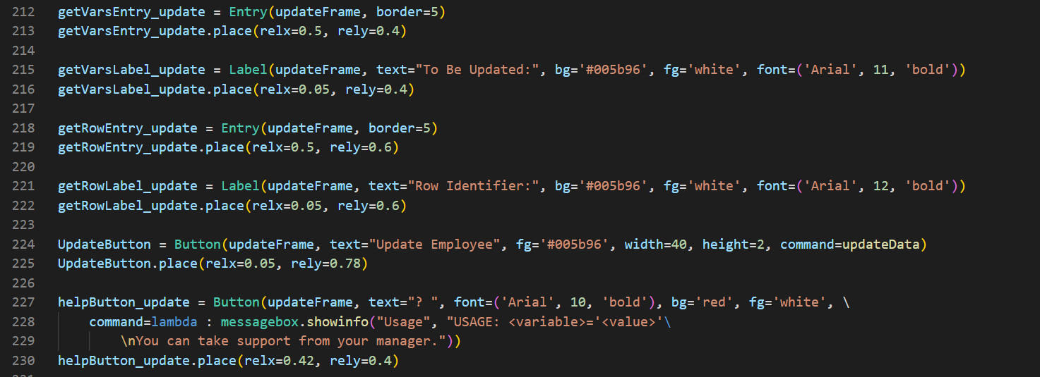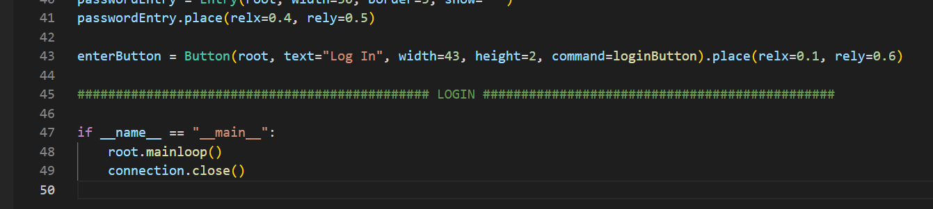 ############################################## LOGIN ##############################################def loginButton(): myCursor.execute("SELECT username FROM administrators") results = myCursor.fetchall() for result in results: for selected in result: if usernameEntry.get() in selected: myCursor.execute(f"SELECT password FROM administrators WHERE username='{selected}'") passwd = myCursor.fetchall() if passwordEntry.get() == passwd[0][0]: messagebox.showinfo("System Message", "Successfully logged in.") exec(open("employee.py").read()) else: return messagebox.showinfo("System Message", "Username or password is wrong.")welcomeLabel = Label(root, text="Welcome.", font=('Arial', 20, 'bold'), bg='#005b96', fg='red', pady=100).pack()usernameLabel = Label(root, text="Username: ", font=('Arial', 14), bg='#005b96', fg='white')usernameLabel.place(relx=0.1, rely=0.4)passwordLabel = Label(root, text="Password: ", font=('Arial', 14), bg='#005b96', fg='white')passwordLabel.place(relx=0.1, rely=0.5)usernameEntry = Entry(root, width=30, border=5)usernameEntry.place(relx=0.4, rely=0.4)passwordEntry = Entry(root, width=30, border=5, show="*")passwordEntry.place(relx=0.4, rely=0.5)enterButton = Button(root, text="Log In", width=43, height=2, command=loginButton).place(relx=0.1, rely=0.6)############################################## LOGIN ##############################################if __name__ == "__main__": root.mainloop() connection.close()