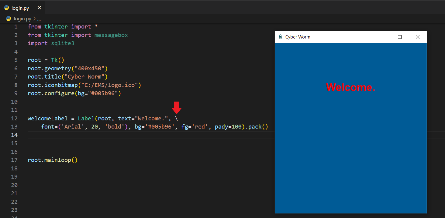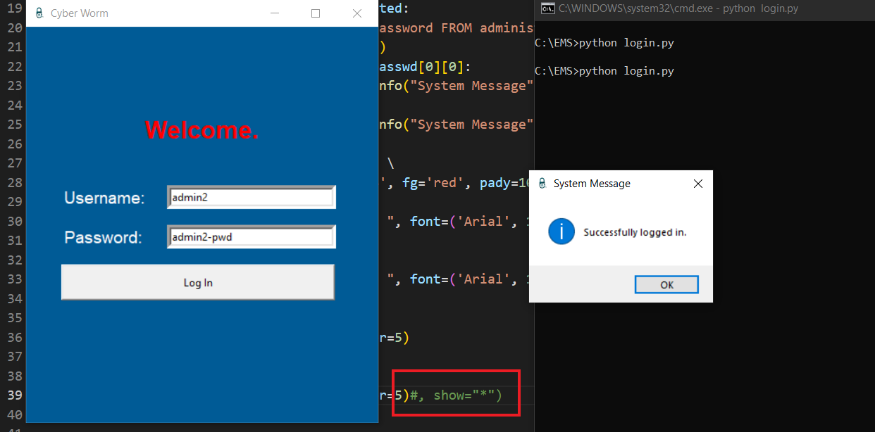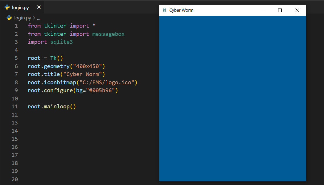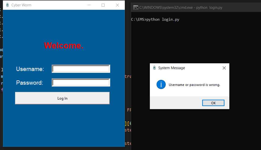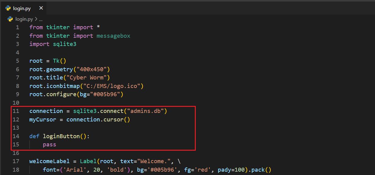 login.pyfrom tkinter import *from tkinter import messageboximport sqlite3root = Tk()root.geometry("400x450")root.title("Cyber Worm")root.iconbitmap("C:/Python/EMS/logo.ico")root.configure(bg="#005b96")connection = sqlite3.connect("admins.db")myCursor = connection.cursor()