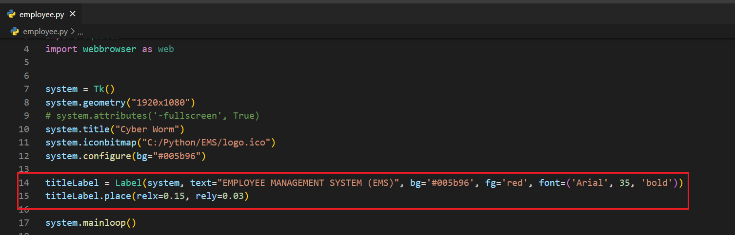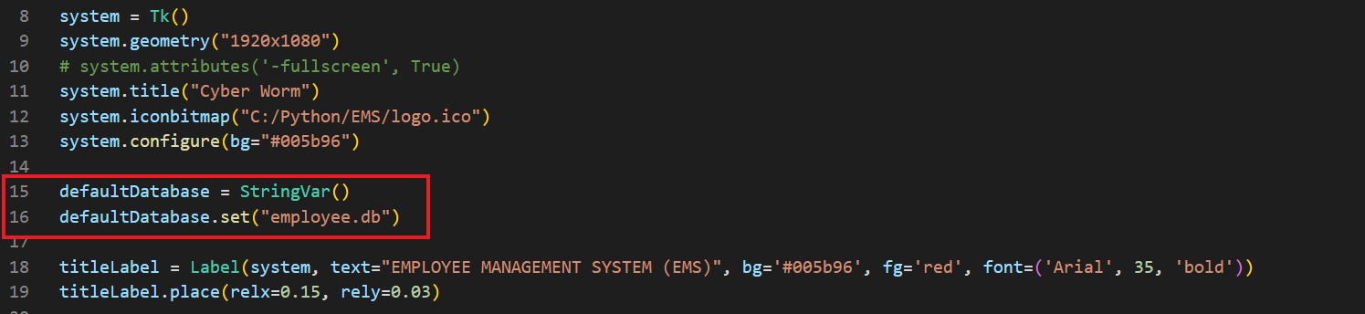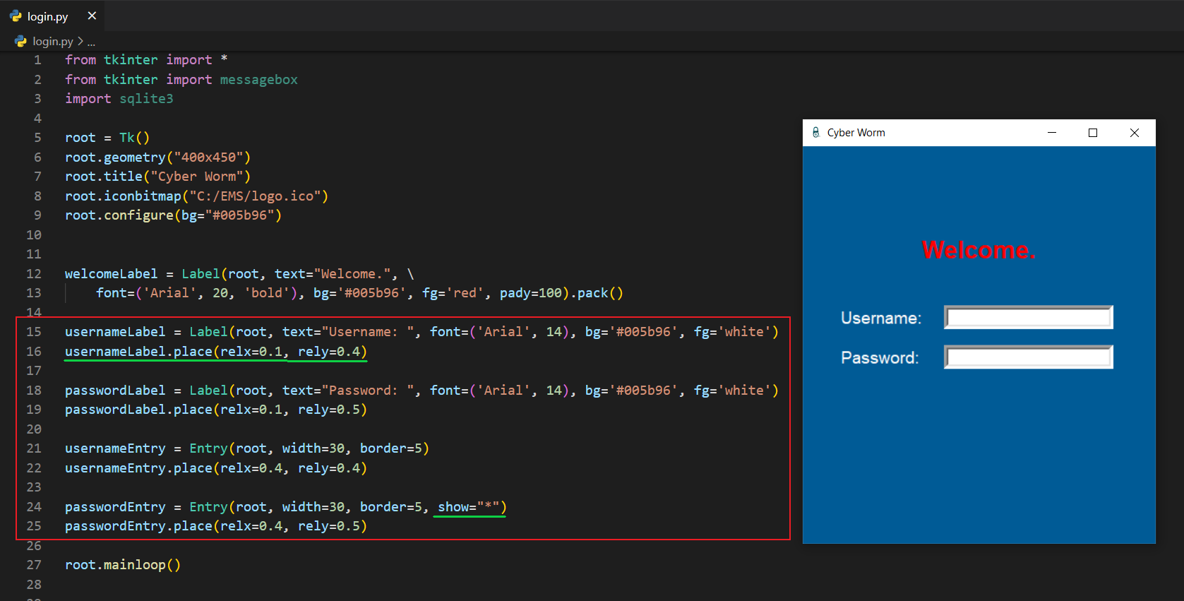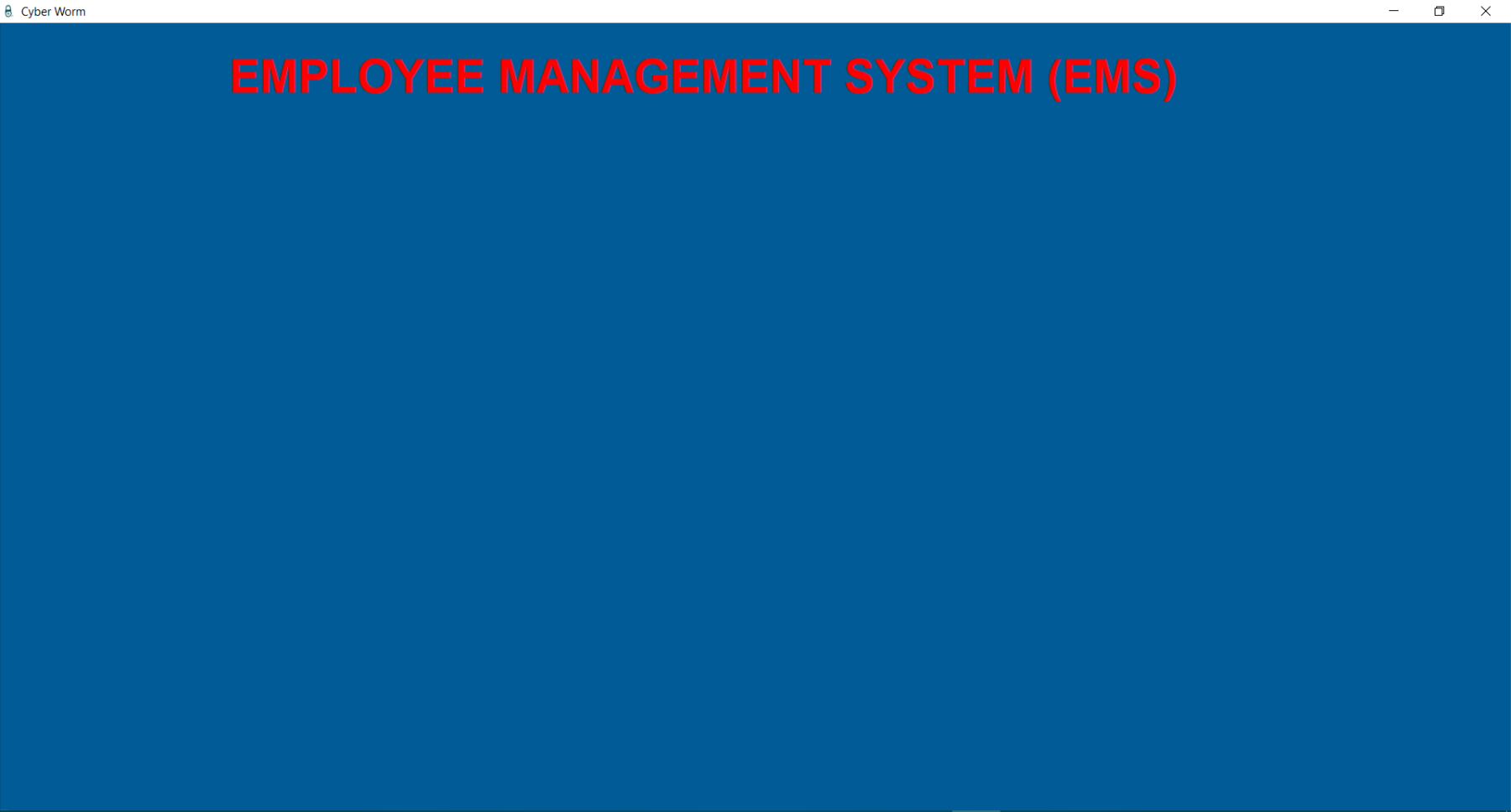 login.pyfrom tkinter import *from tkinter import messageboximport sqlite3root = Tk()root.geometry("400x450")root.title("Cyber Worm")root.iconbitmap("C:/Python/EMS/logo.ico")root.configure(bg="#005b96")connection = sqlite3.connect("admins.db")myCursor = connection.cursor()