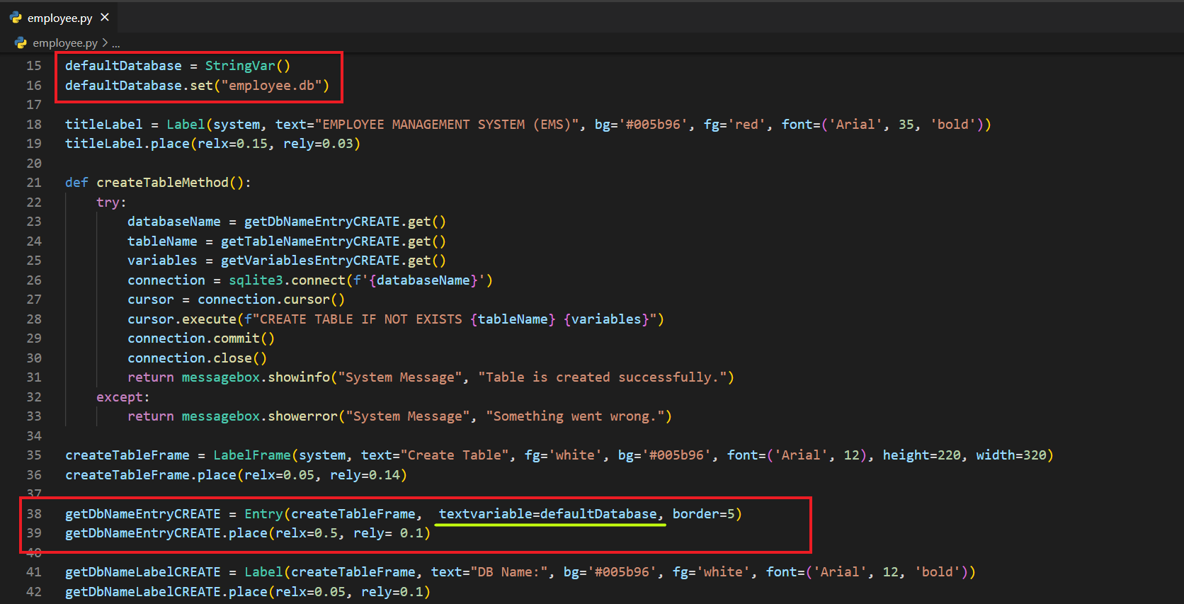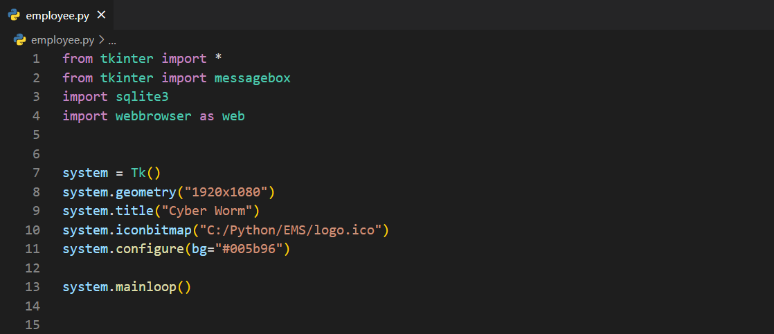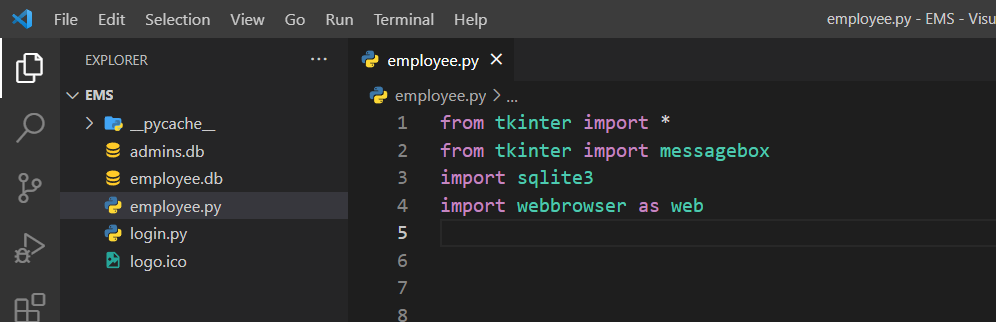 Bunun için employee.db isminde bir veri tabanı ve employee.py isminde bir dosya açıyorum. Hemen sonrasında employee.py dosyasına gerekli modülleri aktarıyorum.